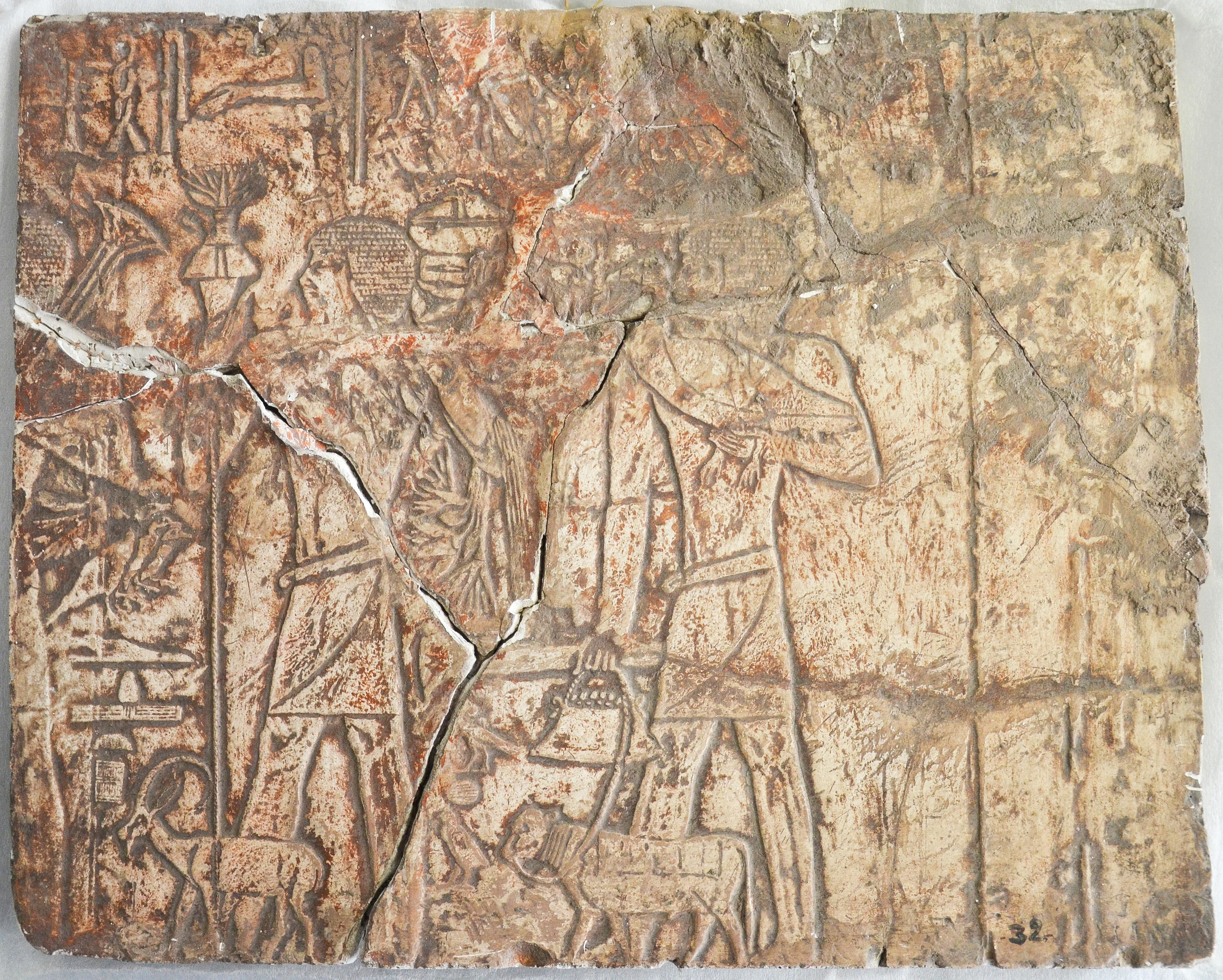 Formato cuadrado horizontal. Plano central dos personajes de perfil izquierdo, cuerpo completo; el personaje de la izquierda lleva en su mano derecha una tea de fuego. Al fondo letras egipcias o signos. Abajo dos animales en posición de perfil izquierdo, de cuerpo entero y acción caminante.