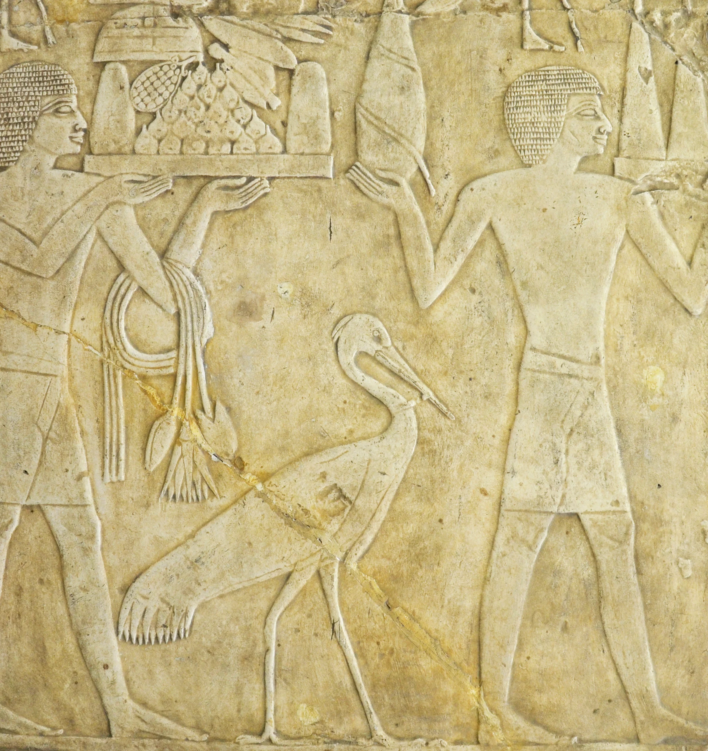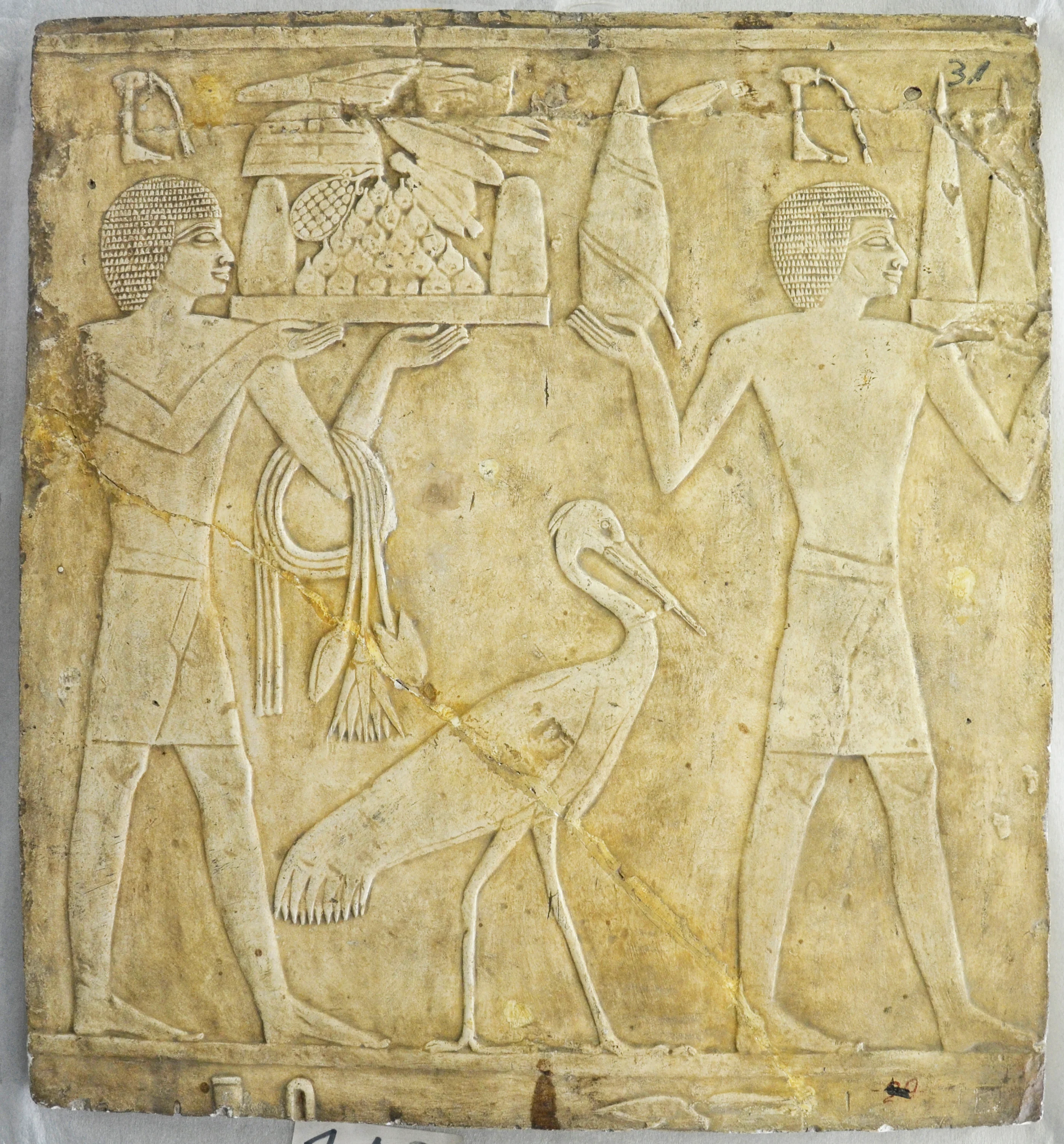 Formato vertical, rectangular. Dos hombres de perfil derecho, (ojos y hombros de frente) de cuerpo entero. El de la izquierda levanta con las dos manos y a la altura del rostro, un plato con frutas. El otro lleva en la mano derecha abierta una figura y en la otra mano tres conos. En el brazo izquierdo del anterior cuelga un lazo con remate de borlas. Al centro de los dos personajes de piernas abiertas, se encuentra una garza de perfil. Los personajes descansan en un piso logradopor una línea que atraviesa el fondo horizontalmente. Arriba y abajo otros elementos ilegibles.