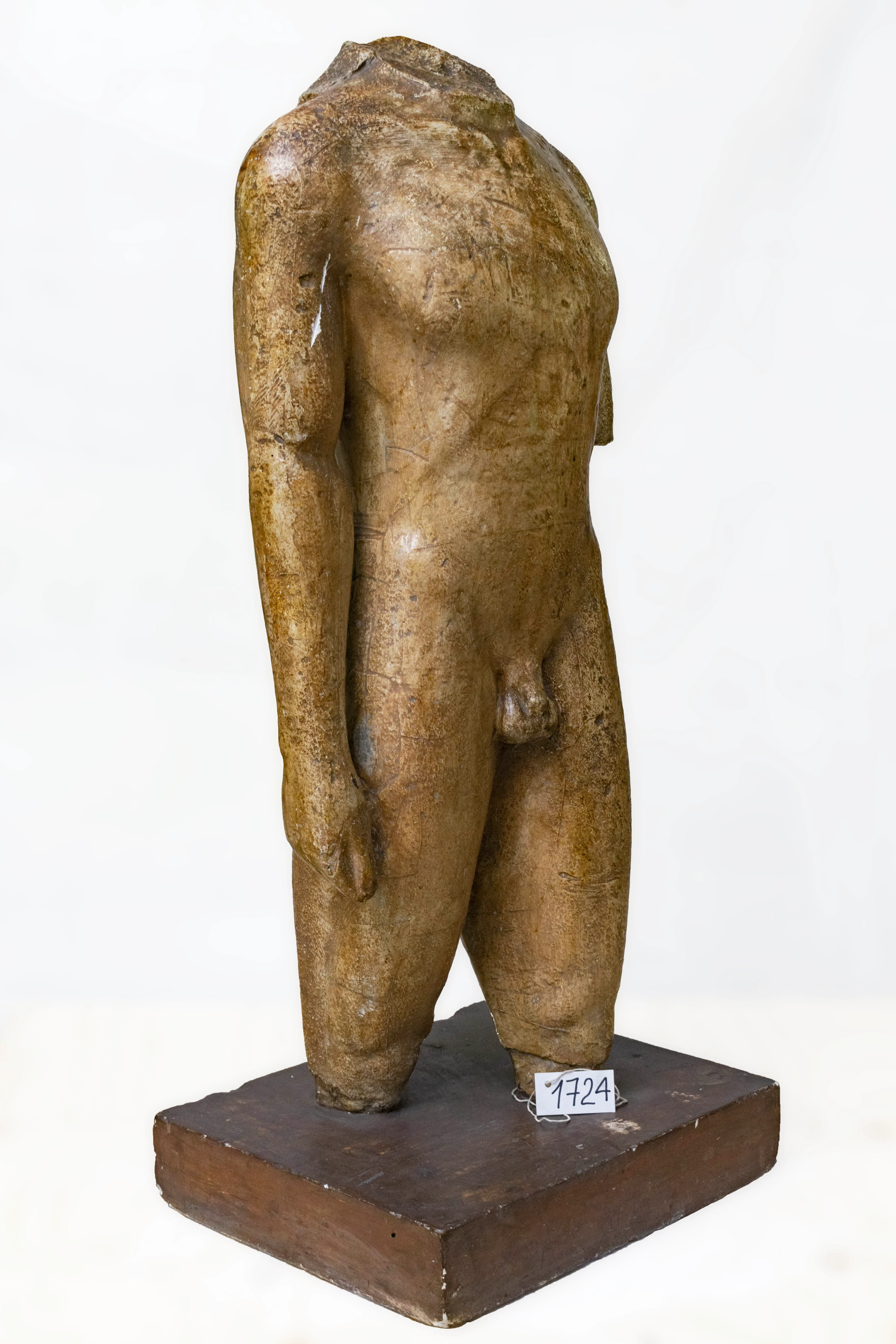 Figura masculina frontal (sin cabeza, brazo izquierdo ni piernas) desnudo, brazo derecho estirado y apoyado sobre el muslo, empuñando algo indescriptible en su mano. Pierna izquierda adelantada. Al reverso de la cabeza, un tocado que cae por la espalda. Base rectangular.