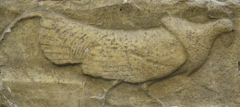 Formato rectangular horizontal. Figura central de un ave de perfil derecho, cuerpo completo; cresta hacia arriba, pecho sobresaliente (emplumado) y cola recta, en posición andante.