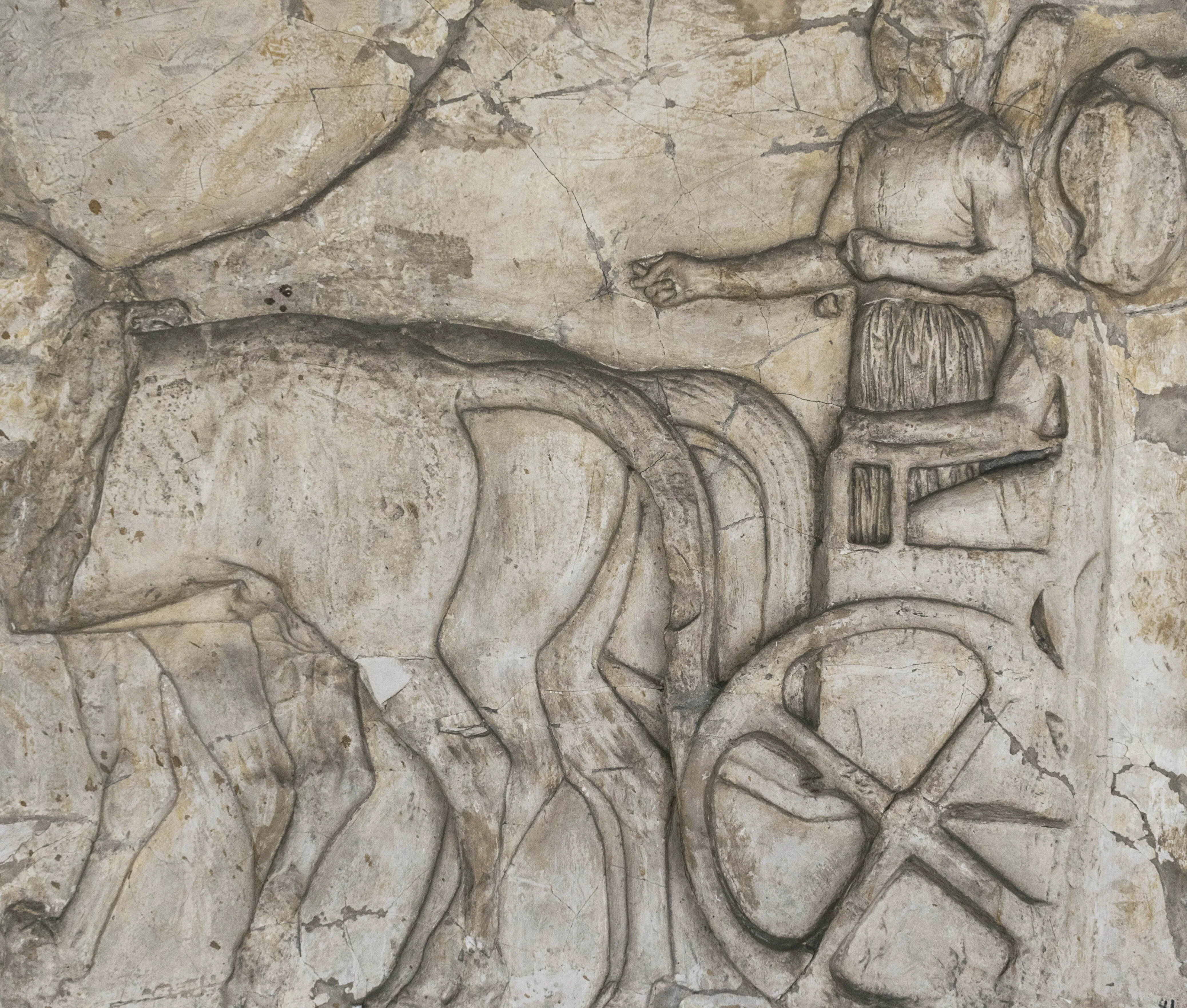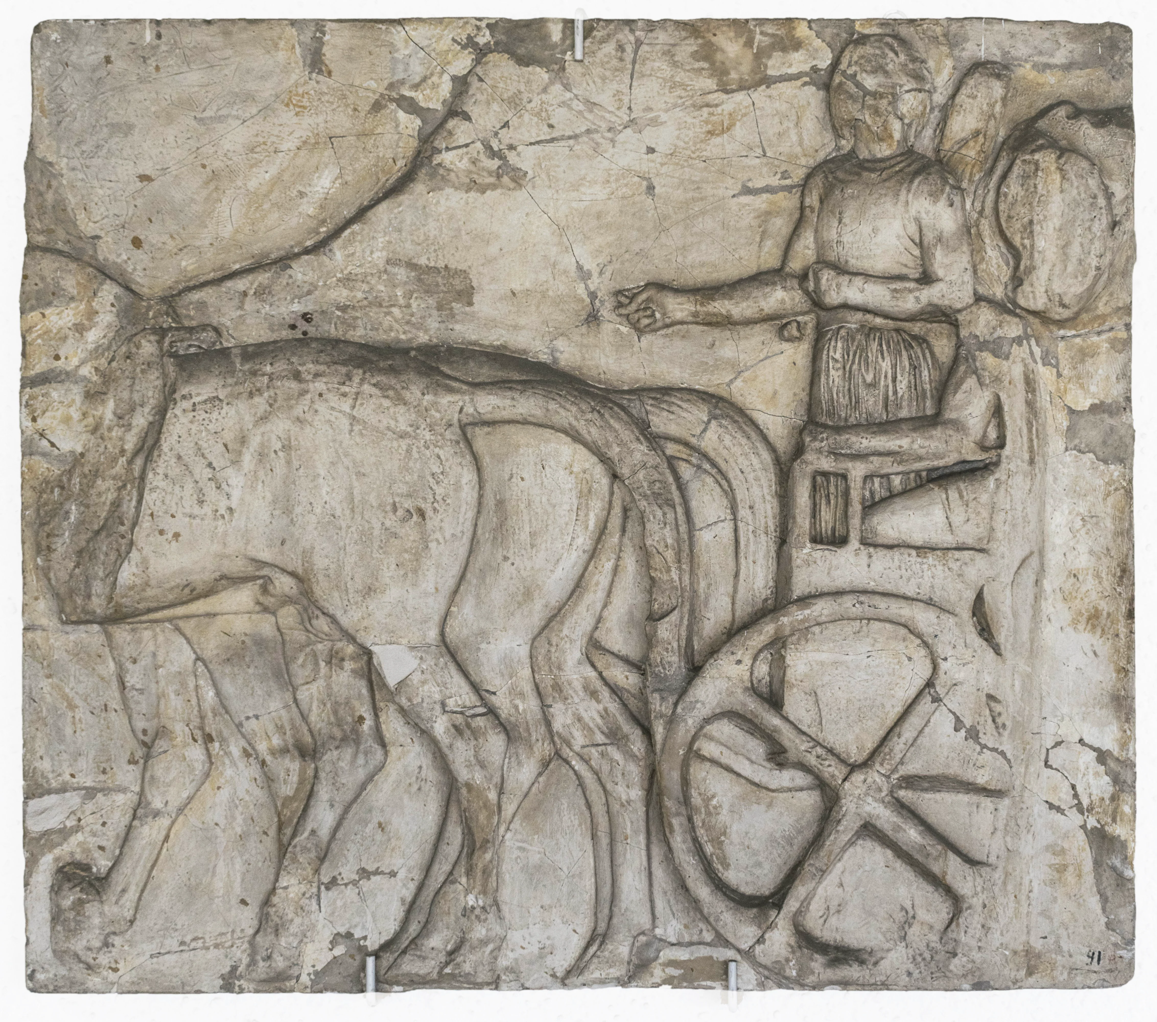 Formato rectangular horizontal. A la izquierda un hombre de perfil en una carroza de la cual solo se observa una rueda; el hombre de rostro solamente insinuado, antebrazos rectos, brazos flexados con Las manos cerradas. A la derecha torso de animales de perfil en acción de caminar.