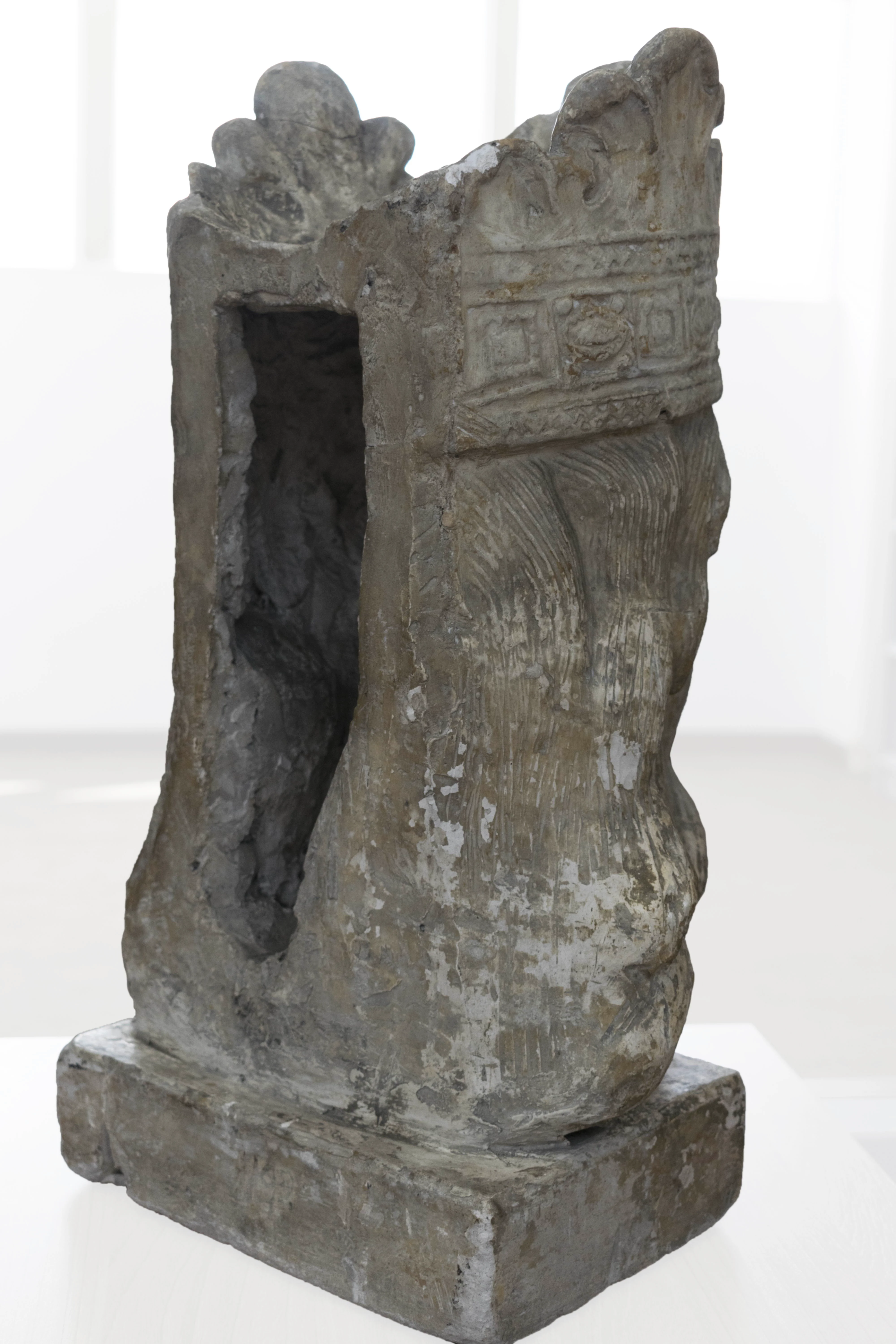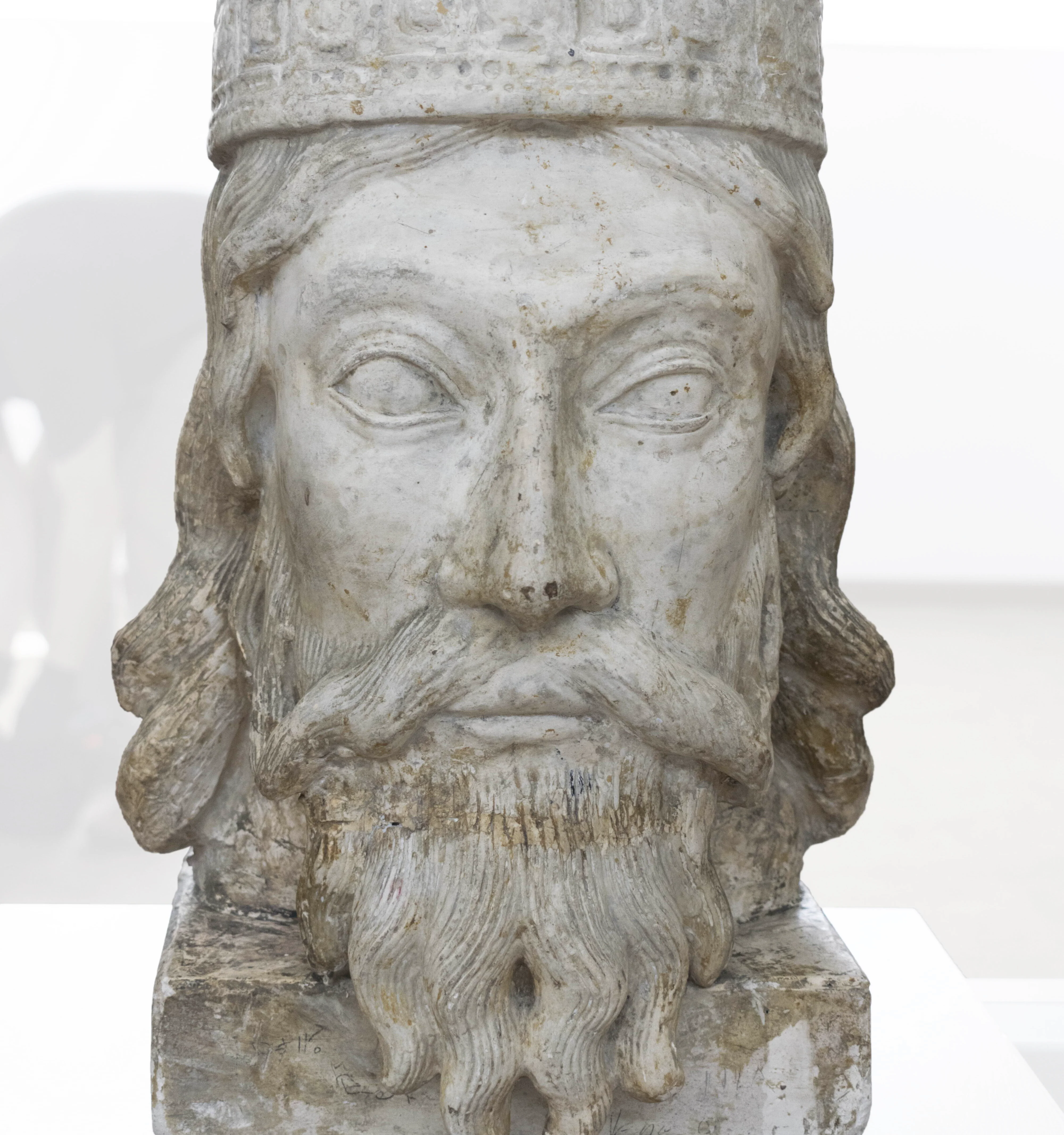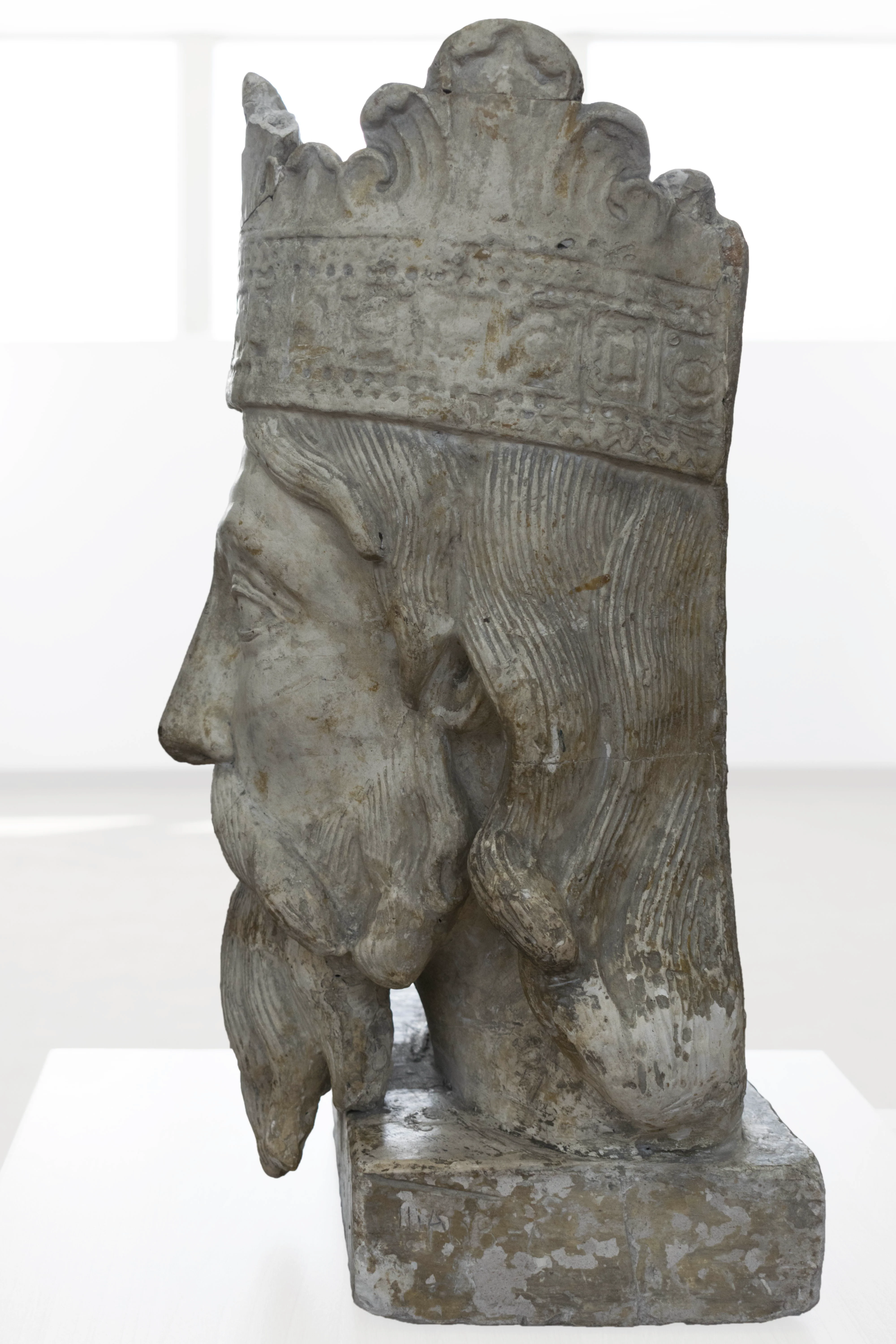 Rostro de hombre. Posición de frente. Cabeza ligeramente girada hacia la derecha; ojos muy grandes ovalados; nariz recta; labios gruesos, cabellos levemente ondulados y largos; barba y bigote; sobre su cabeza se apoya una coronad de rey. Peana o base de forma rectangular